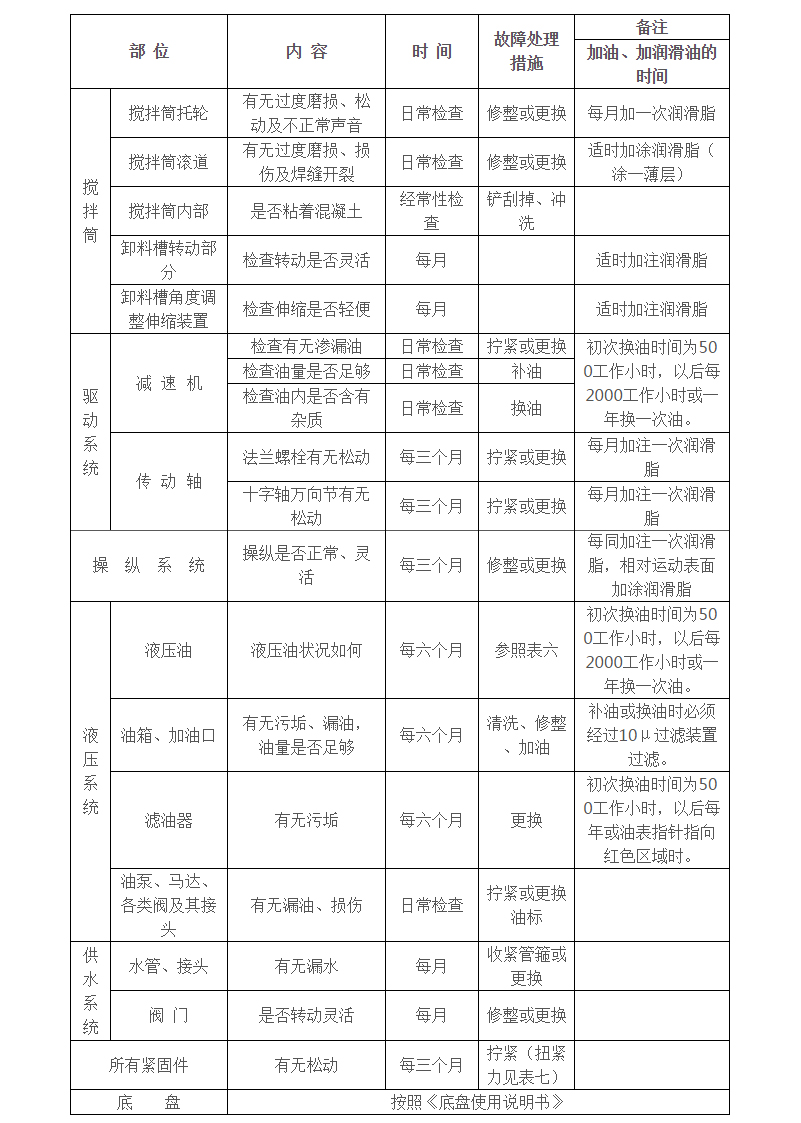混凝土搅拌罐车的使用寿命,很大程度上取决于使用者的保养力度,即使是再好的混凝土搅拌罐车,平时粗暴使用,不注重保养,故障频发将是迟早的事。现在一张图表就可以完成让你掌握混凝土搅拌罐车的搅拌筒、液压系统、驱动系统、操纵系统、供水系统、所有紧固件等混凝土搅拌罐车常见保养措施和日常检查标准动作,赶紧看看,特别是新手,老机手可以飘过。
